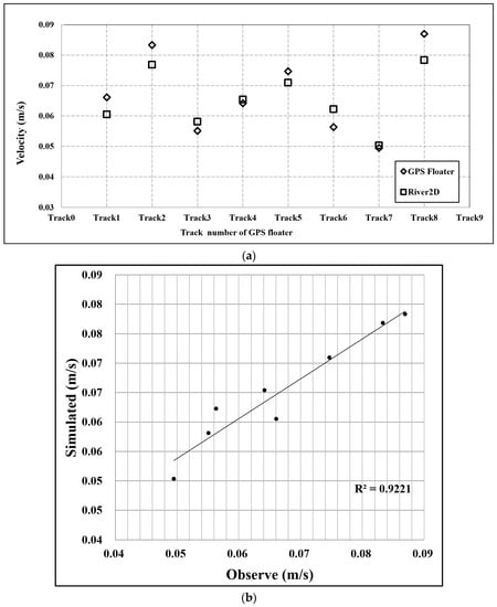 Excluding two GPS drifters with overlapping path lines, the average flow velocity of the remaining 8 GPS drifters in the pre-determined section (Track 1–Track 8; velocity range: 0.0563–0.0870 m/s) was calculated. Results are shown in Table 2. River2D simulation was run under the same conditions as those in the field experiment, i.e., water discharged into the by-pass fishway only without operating the movable wire. Results of comparison between the in situ experiment data and numerical simulation data under the same boundary conditions are shown in Figure 6. The coefficient of determination (R2) and the root-mean-square error (RMSE) were 0.9221 and 0.000026, respectively. Thus, results of River2D simulation demonstrated high reliability.