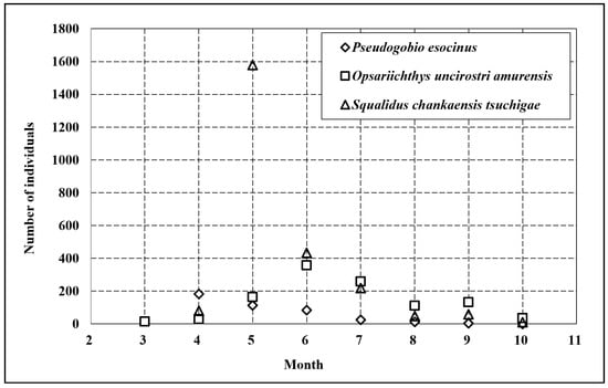 Table 3 presents the fish species from the monitoring. A total of 5099 individuals of 12 species belonging to 3 genera used the fishway. The number started to increase from April when the spawning season began. The fishway was used most frequently by Squaliduschankaensistsuchigae (Korean gudgeon), followed by Opsariichthysuncirostrisamurensis (Korean piscivorous chub) and Pseudogobioesocinus (goby minnow). Before the construction of the Gangjeong-Goryeong Weir, Zacco platypus (pale chub) was the predominant species [9]. Figure 7 shows graphs displaying data at monthly intervals for the three major fish species using the fishway. Figure 7 shows that P. esocinus, S. chankaensis tsuchigae, and O. uncirostri amurensis used the fishway most frequently during the spawning period (April, May, and June, respectively).