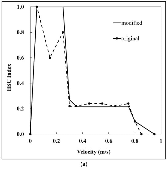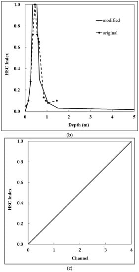 Habitat Suitability Criteria (HSC) versus each of the flow velocity, water depth, and channel substrate indices for P. esocinus used in this study are shown in Figure 8. The peak HSC value for flow velocity was set in excess of usual HSC in consideration of burst swimming speed of P. esocinusas shown in Figure 8a. The HSC for the water depth was also set at the maximum possible value because P. esocinus could swim at a considerable water depth (Figure 8b). P. esocinus is calculated by applying the HSC for the channel index of 1.0 as it mainly inhabits the gravel layer.