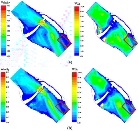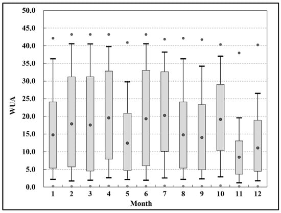 Nevertheless, attraction efficiency can be improved to a certain degree by adjusting the flow rate. The values of WUA, the indicator of attraction efficiency used in this study, are not clearly distinguishable by month or flow rate as shown in Figure 9. Therefore, a specific area near the fishway entrance was set (the area highlighted with a red line in Figure 2 and Figure 9). Monthly box plots including the average and peak values of WUAs of the nodes within this area are displayed in Figure 10. As a result, July was revealed to be the month having the highest average WUA (20.27), followed by April (19.57) and June (19.33). The peak WUA value was 43.23 in April and June. These findings indicated that the fishway attraction efficiency was the highest in April followed by June. The target species P. esocinus used the fishway most frequently in April. However, many other species used it frequently in June (Table 3). A good agreement was obtained between species monitoring data from the in situ experiment and the WUA values obtained by numerical simulation, proving that WUA is an appropriate indicator of fishway attraction efficiency.