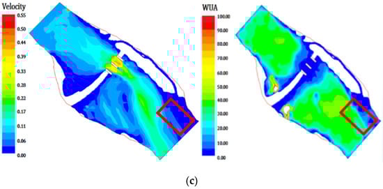Presentation of the calculated values of velocities (m/s) and the weighted Usable Areas in the region of Gangjeong-Goryeong Weir in (a) April; (b) May; (c) June.