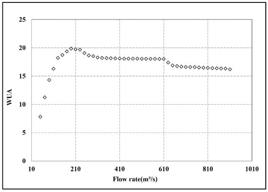It was confirmed that the WUA value as the indicator of attraction efficiency changed according to monthly variation of flow rate. In addition, WUA value tended to increase as the flow rate was increased. However, there are some exceptions. For example, the representative flow rate in October of 2013 was 236 m3/s (Table 1). However, the corresponding average WUA value was lower than that in April (representative flow rate was 183 m3/s). This suggests the necessity of deriving an optimal flow rate to achieve the maximum attraction efficiency, i.e., the highest WUA value, by numerical simulation. By operating the sluice gate of the movable weir at the Gangjeong-Goryeong Weir, the flow rate of the main channel was adjusted between 50 and 910 m3/s at intervals of 20 m3/s to simulate the average WUA values in the predetermined area (red box in Figure 2 and Figure 9) as represented in Figure 11. Simulation results revealed that WUA was the highest (19.87) at the flow rate of 190 m3/s. It began to gradually decrease from 210 m3/s onwards. This finding indicated that the flow rate of the main channel at the Gangjeong-Goryeong Weir should be maintained at 190 m3/s in order to attract the target fish species into the entrance of the fishway efficiently. The flow rate management through an adequate operation of sluice gates to maintain this optimal level is especially important to facilitate upstream and downstream migration to and from the spawning grounds during the spawning season (April–June) of the target fish species P. esocinus.