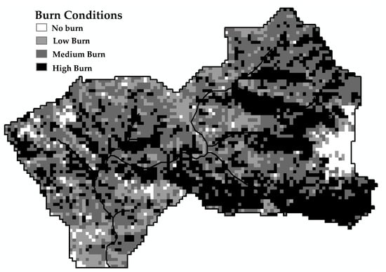 - Moody, J.A.; Martin, D.A.; Haire, S.L.; Kinner, D.A. Linking runoff response to burn severity after a wildfire. Hydrol. Process. 2008, 22, 2063–2074. [Google Scholar] [CrossRef]
