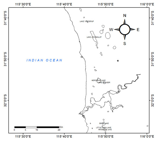 Map of the locations of the studied lakes along the Swan Coastal Plain, Western Australia. The seven lakes selected for this study are Lake Yangebup, Little Rush Lake, Bibra Lake, Lake Monger, Herdsman Lake, Lake Joondalup, and Lake Yonderup.
