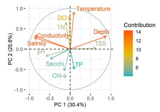 A summary of the statistics of the 11 environmental variables measured in seven lakes is presented in Table 2. Lake open water area ranged from 0.0057 km2 to 4.55 km2, covering small to large lakes situated in mostly urbanised areas. Secchi depth and average water depth differed among lakes. Field sampling was conducted during spring (September to November 2016) when maximum air temperature ranged from 20.3 to 24.2 °C, and significant differences between lakes were observed. Mean conductivity differed significantly among lakes ranging between 0.71 and 2.17 mS cm−1. Mean salinity in all lakes also varied significantly with higher salinity observed in Lake Yangebup and Joondalup, mean salinity being 1229 ppm and 1012.62 ppm, respectively. All lakes were considered eutrophic based on the concentration of total phosphorus (TP) >30 µg L−1 [55]. Eutrophication indicators showed large gradients in the data sets, including TP ranging from 0.21 to 0.81 mg L−1 and TN from 0.10 to 2.75 mg L−1, water transparency (measured as Secchi depth) ranging from 0.5 to 0.9 m, and chl-a concentration varying from 1.92 to 24.95 µg L−1. One-way analysis of variance (ANOVA) showed a significant difference in TN, TP, and chl-a between lakes (all p < 0.05). A PCA ordination using all environmental variables (Figure 2) revealed that ~30% of the variability in environmental characteristics was explained by eutrophication indicators including chl-a, TP, pH, and Secchi depth, while ~26% was explained by other variables including suspended solids, temperature, DO, mean depth, salinity, and conductivity.