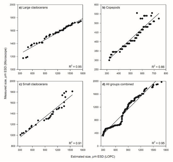 Thirty to 100 individuals of the three zooplankton size classes (large-sized daphnia, small cladocerans, and copepods) were introduced through a sample chamber and passed through the LOPC to obtain data of counts and biomass of each size group. Data of zooplankton abundance (particle counts) and size (ESD, µm) of groups collected from the LOPC and microscopic examination were compared and then plotted and fitted to a linear regression model to assess the fitness between the two estimates.