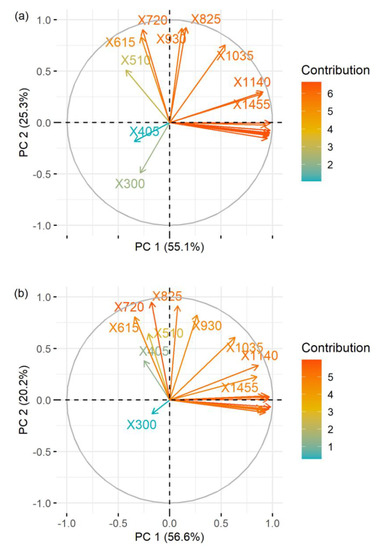 Biplots for the principal component analysis (PCA) based on zooplankton (a) biomass and (b) density in 105 µm equivalent spherical diameter (ESD), where arrows represent zooplankton biomass or density in each 105 µm bin. The colour scale of the arrows represents the strength of the contribution. For example, 300 represents the density of zooplankton from 300–404 µm ESD size fraction, while 405 represents density of zooplankton from the 405–509 µm ESD range. All data were log10(1+x) transformed.