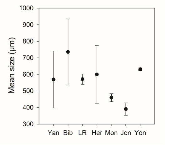 Mean body size averaged for each lake showing the average smallest and largest size from three to four sampling points at each lake; all sizes are in µm equivalent spherical diameter (ESD). Study lakes are indicated along the x-axis with Yan = Yangebup, Bib = Bibra, LR = Little Rush, Her = Herdsman, Mon = Monger, Jon = Joondalup, and Yon = Yonderup.