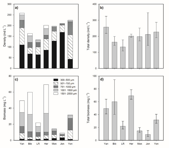 Mean values (± standard deviation, SD) of total and within-zooplankton size groups density and biomass in the seven lakes. (a) Density within the five size classes; (b) total density (means and SD) in each lake; (c) biomass of the five size classes; and (d) total biomass (means and SD) in each lake. All size classes are in µm equivalent spherical diameter (ESD). Study lakes are indicated along the x-axis with Yan = Yangebup, Bib = Bibra, LR = Little Rush, Her = Herdsman, Mon = Monger, Jon = Joondalup, and Yon = Yonderup.
