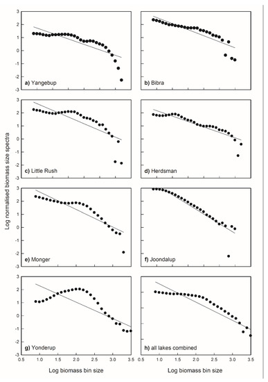Mean normalised biomass size spectra (NBSS) of seven lakes: (a) Yangebup, (b) Bibra, (c) Little Rush, (d) Herdsman, (e) Monger, (f) Joondalup, (g) Yonderup, and (h) all lakes combined in one analysis. The NBSS was determined based on biomass data in 15 µm equivalent spherical diameter (ESD) bin size intervals, as derived by the Laser Optical Plankton Counter, for size fractions between 300 and 2500 µm ESD.