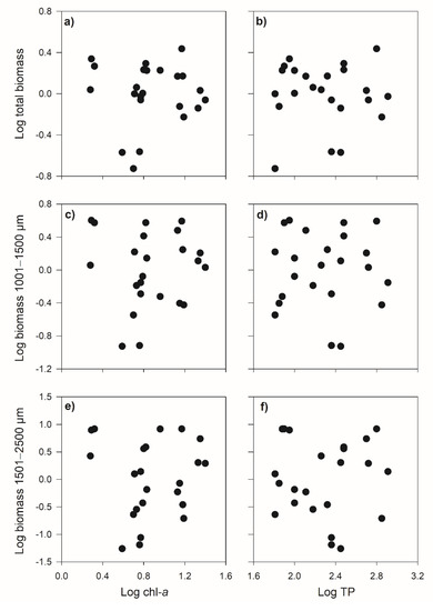 Multiple linear regression, displayed as scatter plots, between environmental variables chlorophyll-a (chl-a) and total phosphorus (TP) and the biomass of different size groups. Between chl-a and TP and: (a,b) total biomass; (c,d) biomass size fraction 1001–1500 µm; and (e,f) biomass size fraction 1501–2500 µm.