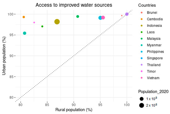 Improved water sources encompass safely managed, basic, and limited drinking water services. A safely managed drinking water service is one that is located on the premises, available when needed, and free from contamination. The limited drinking water category misses an aforementioned safely managed criteria and involves over 30-min roundtrip to collect water [11]. While all the Southeast Asian countries showed either no change or increased access to improved water sources in urban and rural areas since 2000, Malaysia is the only nation with a negative growth rate in improving access to at least limited water services with −0.16% (urban) and −2.9% (rural) [11]. Lower middle income countries such as Laos, Cambodia, and Vietnam reported the highest growth rate in expanding access to improved water sources in rural localities by 120%, 72%, and 69%, respectively, over a period of 20 years [11]. Figure 2 shows the percentage of urban population with access to improved water sources versus the rural population of Southeast Asia in 2020. Thailand has reached 100% access to at least limited water services in both urban and rural areas. However, in the majority of the countries, especially Cambodia, Laos, Myanmar, and East Timor, an urban–rural gap is still observed (Figure 2). In 2020, Cambodia and the Philippines’s percentages of the population using safely managed drinking water were significantly below the global average (74.27%), which was only 27.76% and 47.46%, respectively, with Malaysia and Singapore at 93.82% and 100%, respectively [11]. Data for other countries were not available, which presumably would account for low percentages, except Brunei. Of the 24.82% of Cambodians, there is also a huge disparity between urban and rural communities, where only 55.29% of urban and 15.95% of rural populations had safely managed water services in 2015 [11]. In 2000, 5% of Malaysian rural dwellers relied on surface and unimproved water for domestic consumption compared to only 1% of urban people [11]. This inequality was further aggravated by the widened urban–rural gap from 4% in 2000 to 9% in 2017 [38]. Infrastructural complexities pose a crucial challenge in low income countries in the efforts to improve public water services to rural localities. The reasons for the lack of a public centralized water treatment facility include a (i) location that is far from major treatment centers; (ii) huge investment required for centralized systems in remote locations [66]; and (iii) lack of financial resources and funding support. In fact, some countries experience a funding gap of 61% to achieve the SDG water and sanitation targets, and only less than 15% of nations worldwide have the financial capacity to execute their water development plans [67]. According to the UN-Water Global Analysis and Assessment of Sanitation and Drinking Water 2019 Report, Indonesia, Laos, Myanmar, the Philippines, Thailand, and East Timor have less than 50% financial resources needed to implement drinking water provision plans, especially in rural areas [67].