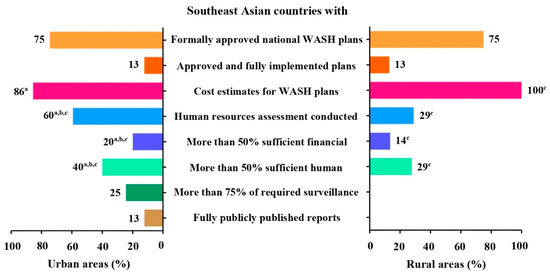 Percentage of Southeast Asian countries (excluding Brunei, Malaysia, and Singapore) with approved and implemented WASH plans, cost estimates, and human resource assessment conducted for those plans, more than 50% sufficient financial and human resources, more than 75% required frequency of surveillance in practice compared to the requirements and regulatory authorities publish publicly accessible reports on drinking water quality. a—without data from Cambodia; b—without data from Myanmar; c—without data from Vietnam. [dataset] WHO. 2019. UN-Water global analysis and assessment of sanitation and drinking-water (GLAAS) 2019 report.