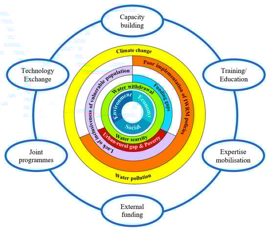 Water security issues faced by most Southeast Asian countries are multifactorial and can be categorized into three overlapping segments, namely environment, economic, and social factors (Figure 5). Freshwater scarcity, water withdrawal exceeding water supply, poor implementation of IWRM policies, funding gap, widening urban–rural gap, poverty, lack of inclusivity of vulnerable population, water pollution, and climate change further perplexed the problem. These can impede a country’s progress toward achieving SDG 6 In this regard, each country has to focus on their capacity building in terms of acquiring and improving the necessary skills, knowledge, tools, equipment, and other resources to achieve water sustainability. While the time required to reach potential capacity to self-sustain IWRM might vary between countries, there is a need to adopt organizational hybridity to ensure access to safely managed water services in recognition of human rights to clean water and to leave no one behind.