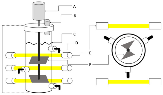 Reactor configuration. (A) Motor, (B) gas outlet sampling, (C) surface of culture, (D) sampling ports, (E) LED lamp, and (F) agitation paddle.