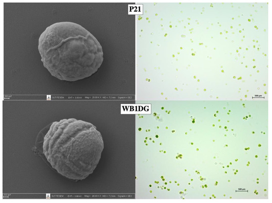 Chlorella sorokiniana strains P21 and WB1DG. The images were observed using SEM (left) and compound (right) microscopy.