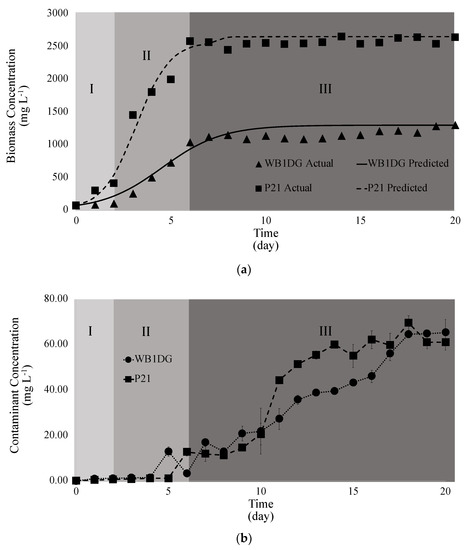 Biomass concentration of the culture of microalgae C. sorokiniana WB1DG and P21 over 20 days of cultivation in the different phase of growth; (I) lag, (II) exponential, and (III) stationary phases of the culture. (a) Algal biomass and (b) contaminant biomass. All the data were based on the mean values of triplicate experiments.