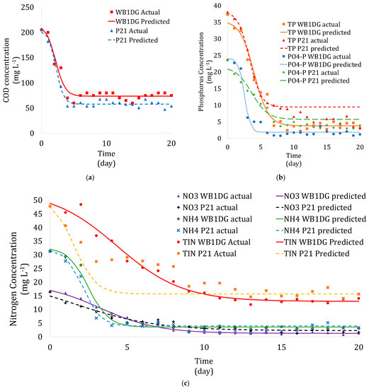 Table 3 shows the results of the Verhulst model applied in the removal of wastewater constituents over a 20-day period. All the parameters in the Verhulst kinetic model were suitable for modeling the growth and removal rates in the system. Interestingly, the removal rates of substrates (μs) of all parameters except NO3-N and TIN-N were higher than the growth rate of the microalgae (μbiomass). This result indicates that the removal processes did not all result from algal biological process. Some of the algal biological processes might operate in the precipitation of phosphorous and nitrogen stripping of ammonium to form ammonia gas [37]. A reduction in NH4 and NO3 in the control experiment was observed (Figure S3). The resulting kinetic parameters are in line with depletion of NH4-N as discussed above. Although significant removal of ammonium was assumed from the biological process, the results also suggest there must be another way of utilizing the source of NH4-N, since the rate of removal was higher than in the biomass growth, such as precipitation [59]. Similarly, PO4-P and orthophosphate were removed under the process called luxury uptake. However, precipitation might have contributed to removal, since the rate of P removal was higher than the biomass growth rate. It is interesting to note that COD removal by the P21 and WB1DG cultures—73.78 and 63.42%, respectively—can explain the PO4-P and TP removal rate. Constant COD remaining in the wastewater suggests the presence of extracellular polymeric substances (EPS), mainly from photosynthesis. Removal of PO4-P and TP might have been partially a result of precipitation mediated by algal photosynthetic activity [69].