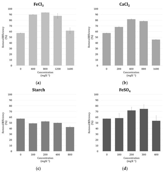 Harvestability of microalgae is one of the main bottlenecks to industrialized algal-based biofuel. There are many harvesting methods available nowadays. However, coagulation–flocculation is one of the preferable harvesting methods in many recent studies [37,71]. Several coagulants and a flocculant were used to obtain an optimal removal, ferrous sulfate (FeSO4), ferric chloride (FeCl3), calcium chloride (CaCl2), and starch (S). Smaller-scale coagulation and flocculation tests are feasible with limited amounts of culture and more replications in harvesting experiments [37]. Here, a similar approach was employed to examine these four coagulants.