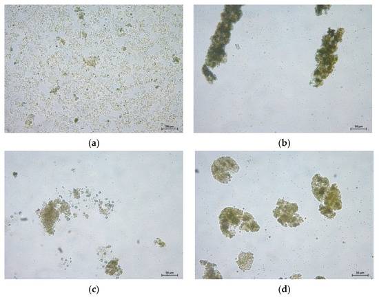 Modified starch was reported to require 20–40 mg L−1 doses for >80% removal [74]. Similarly, 20–30 mg L−1 doses of maize starch reduced turbidity in an algal suspension from >100 NTU to <20 NTU [75]. However, incomplete removal of starch has also been reported [76]. This result may be related to insufficient cationic groups in the modified starch. Higher doses of modified starch can increase the turbidity of water. It can be seen in Figure 8 that the formed flocs were not as compact as when other flocculants were used. Moreover, the P21 strain was found to settle more quickly in the absence of S as a flocculant. This result is similar to the use of Scenedesmus rubescens, which exhibits considerable self-sedimentation [77].