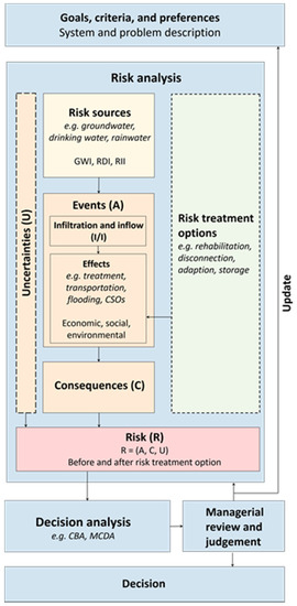 - This paper presents a novel framework for risk-based decision support for handling infiltration and inflow (I/I) to wastewater systems based on established concepts, e.g., definitions by ISO [3], and the decision-making process described by Aven [7]. Fundamental features of the framework are (1) the assessment of the risk of I/I by taking into account the complete chain from the source of I/I to the resulting effects and consequences, using events, consequences, and uncertainties; and (2) taking the three dimensions of sustainability, i.e., economic, social, and environmental aspects, into account.