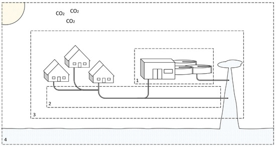 Examples of possible system boundaries (1: WWTP, 2: Piping system, 3: City, 4: Global).