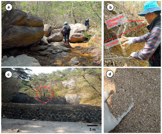 Site survey and regional characteristics in the study area: (a) main channel, (b) erosion, (c) check dam (with a man denoted by a dashed circle to provide scale), and (d) deposition of sediments at the bottom of the basin.