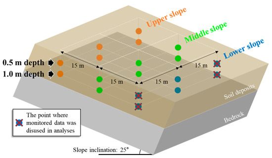 Among the 12 landslide monitoring stations of KIGAM-LAMOS installed across eight national parks in South Korea [4], only the Songnisan station was covered in this study to initially test the aforementioned approach. As illustrated in Figure 4, the VWC sensors were arranged in 18 different subsurface locations to comprehensively investigate the temporal variations of geo-hydrological conditions in the slope at Songnisan station. In more detail, at soil depths of 0.5 m and 1.0 m a 3 × 3 matrix with 15 m longitudinal and transverse intervals was constituted using nine different sensor locations. The slope can be separated into three sections (upper, middle, and lower) according to elevation. For each section of the slope, transient VWCs were monitored from both soil depths, where slip surfaces would most likely exist considering the shallow landslide characteristics of Korea [25]. To reduce sensing instabilities and uncertainties, VWCs were measured at three different locations along the transverse direction for each of the two soil depths. In the lower slope, the data obtained from sensors on both sides for all depths were excluded from this study because of the data anomalies and irregularities possibly caused by sensor malfunctions and instabilities of installation environments. The slope of the Songnisan station was inclined at 25°.