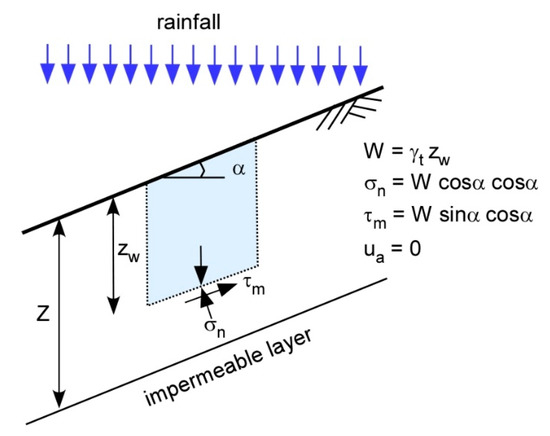 The factor of safety (FOS) equation, which is based on the Mohr–Coulomb failure criterion and the limit equilibrium approach in the infinite slope method, is illustrated in Figure 5 and can be written as shown in Equation (1) by applying the unified model of effective stress (Equation (2)):