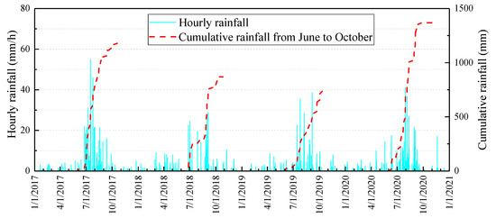 Rainfall and VWC in the slope were monitored for four years between 2017 and 2020 using the KIGAM-LAMOS operational system. Figure 7 shows hourly recorded rainfall distributions with respect to time elapsed during the four years and cumulative rainfall from June to October for each year. The majority of the precipitation was recorded from June to October. Nearly all landslides were reported during this season in South Korea. Accordingly, the period from June to October was designated as the rainy season or landslide-prone season. While the two highest rainfall intensities were observed in 2017, the maximum total cumulative rainfall amount during the rainy season was measured in 2020. This was because, over the entire rainy season, rainfall was more persistent with moderately high intensities in 2020 than in 2017. The total cumulative rainfall during the rainy seasons were 1178.5 mm in 2017, 893.5 mm in 2018, 736 mm in 2019, and 1368.5 mm in 2020. During these four years, multiple landslides were reported in the neighboring regions of Songnisan station during the rainy seasons of 2017 and 2020. Coincidentally, the cumulative rainfalls during the rainy season exceeded 1100 mm in these two years.