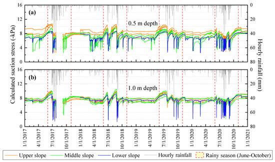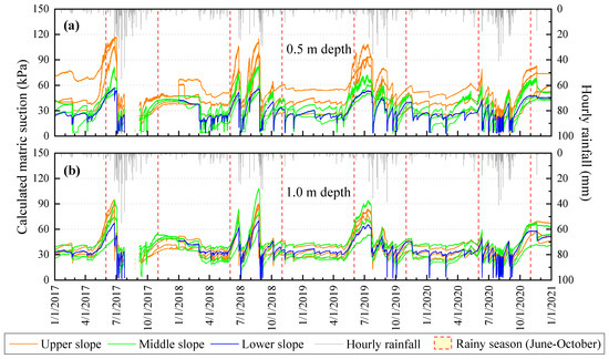 At the 0.5 m depth, the calculated values of matric suction varied from approximately 3 to 120 kPa. At the 1.0 m depth, the calculated values varied from approximately 1.4 to 105 kPa. During the non-rainy seasons, the slope tended to retain a calculated matric suction of approximately 30 kPa on average. However, entering rainy (or landslide-prone) seasons in the summer, the matric suction started to increase as much as the rainfall stoppage term persisted. As mentioned in Section 3.3, it is reasonable to interpret that the progressive increases in matric suction over relatively prolonged rainfall stoppage periods in rainy seasons mainly results from the evapotranspiration effects, whereas the recovery of downward spikes of matric suctions that are instantly induced by rainfall are primarily governed by drainage effects over relatively short periods of time.