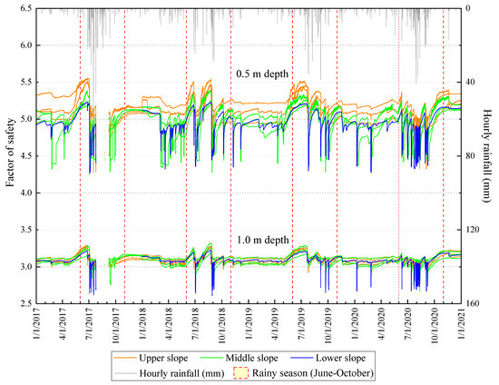 In Figure 12, six main moderate- or high-intensity rainfall events triggered drastic drops in the FOS. In 2017 and 2018, due to rainfall infiltrations, the FOS at 1.0 m (a lower slope section) during major rainfall events decreased to a minimum of 2.619 and 2.606, respectively. The two major rainfall events that triggered the minimum FOS values in 2017 and 2018 exhibited different rainfall characteristics to each other. More specifically, the rainfall event in 2018 gathered a larger rainfall amount with moderate intensities over longer durations, resulting in a slightly lower minimum FOS value than the rainfall event in 2017, which involved rainfalls with high intensities over shorter periods of time. The major rainfall event in 2020 consisted of two instances of rainfall separated by about a 13-h period without rainfall. The reason that the calculated FOS did not further decrease in response to the second instance of rainfall is connected to the limitations of this study, which will be discussed in Section 4.3.