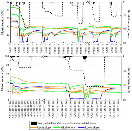 Figure 9 shows temporal variations in matric suction in the Songnisan station slope plotted against the distributions of hourly rainfalls during the four years of the study. The matric suction values were estimated based on the measurements of water content (Figure 8) and the SWCC relationship as formerly shown in Figure 6a. Although matric suction was not a primary source variable for the analyses in this study, but rather a derived variable from VWC, trends of the derived matric suction values were analyzed. This is because the matric suction is considered the most familiar and widely used concept to interpret shear strength properties and consequent sliding phenomena in unsaturated soils [35].