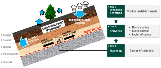 A cross-sectional scheme of the conceptual framework derived from the four-year monitoring study results is illustrated in Figure 14. Soil profiles in natural weathered granite slopes in Korea are typically layered with O-A-B-C-R horizons from top to bottom. As previously mentioned, the formation of sliding surfaces is most often observed in soil horizon transitions from C to R, or within the C horizon. Slope moisture conditions are mainly determined by three different hydrological phenomena: rainfall infiltration, drainage, and evapotranspiration. Rainfall infiltration and drainage govern relatively short-term and instant variations in slope moisture conditions, whereas evapotranspiration is involved in relatively long-term and progressive variations during the summer seasons. The degree of saturation, which represents the slope moisture conditions, was taken as a primary source variable and monitored in this study. Based on the degree of saturation measurements at the typical soil depths of sliding surfaces, we estimated the corresponding matric suctions and suction stresses in unsaturated soils. As a result, the factor of safety values could be derived as the ratios between the resisting shear strengths and the driving shear stresses. Finally, warnings of shallow landslide hazards can be issued if the factor of safety drops below the unity.