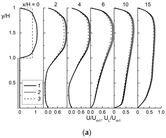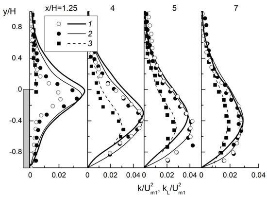 The transverse distributions of the turbulent kinetic energy of the carrier gas and dispersed phases, measured in [16], and the author simulations in several cross-sections behind the BFS are presented in Figure 12. Solid and open symbols are the experimental results of [16]; lines represent author simulations. The turbulent kinetic energy for the gas (air) k and dispersed (water droplets) kL phases is calculated according to the following approach [16]: and . The distributions of turbulence energy for a single-phase flow (1) and the gas (2) and dispersed (3) phases are qualitatively similar. The level of turbulence in a single-phase flow is close to the TKE level in the gas phase of a two-phase gas-dispersed flow. The turbulent energy of droplets is less than the corresponding value for gas (1 and 2). There is a maximum in the turbulence level of the gas and dispersed phases, and it is located in the shear layer. This is characteristic of both the experiments of [16] and our numerical results. The largest values of the turbulent kinetic energy for both phases are observed at the distance x/H = 4–5. In the region of the reattachment point (xR/H ≈ 6.2), the value of the gas turbulence decreases significantly. The results predicted by the authors and experiments of [16] are in quantitative agreement, and the largest difference is up to 15%.