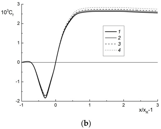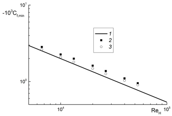 The distribution of the minimum value of the wall friction coefficient in the separation region for single-phase (2) and gas-droplet flows at ML1 = 0.05 (3) vs. the Reynolds number ReH is given in Figure 3. Line 1 is the semiempirical correlation [37] for calculating the wall friction