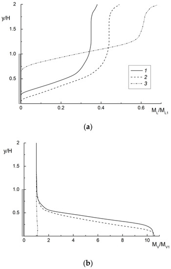 The droplet mass concentration decreases drastically toward the duct wall. The transverse profiles of vapor mass fractions show the opposite tendency for the initial droplet diameter studied (see Figure 4b). Here, , where is the additional mass of steam from the droplet surface created by vaporization. The values of the steam mass concentration are varied from unity (without evaporation) up to 11 at ML1 = 0.05 (the maximal possible steam magnitude and ). The maximum values of the steam mass fraction are found close to the wall of the duct, and the smallest values occur in the duct flow core.