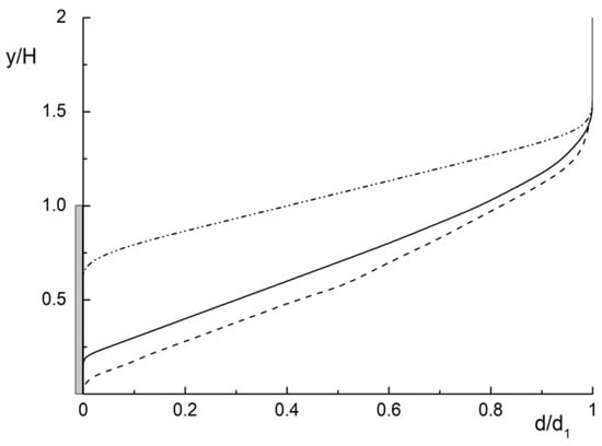 The distributions of the dimensionless diameter of the droplets with a change in their initial size are shown in Figure 5 at a distance x/H = 2 downward from the cross-section of the sudden expansion of the flow. A region free of both the smallest (1) and the largest (3) particles can be seen close to the wall. In the first case, the reason for their absence close to the wall of the duct is the process of their evaporation. For the second case, this is explained by their absence in the entire flow recirculation region due to the large mean Stokes number; such particles are observed only in the shear layer and in the central and “upper” parts of the duct. Droplets of intermediate diameter (2) are observed throughout almost the whole cross-section of the duct. Obviously, in this zone, the droplets’ diameters have the smallest values due to the process of their evaporation, whereas in the flow core, their size almost does not differ from the initial value. This confirms the conclusions in Figure 4a.