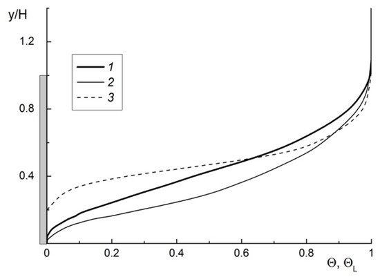 The transverse profiles of gas and droplet ΘL temperatures in the droplet-laden mist flow in a backward-facing step. d1 = 30 mm, Stk = 0.28, x/H = 2. 1: single-phase flow (ML1 = 0); 2: gas phase (ML1 = 0.05): 3: water droplets.