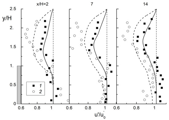 Transverse distributions of the ratio of the two-phase to the single-phase longitudinal pulsation velocities of the single-phase air flow are shown in Figure 11 at three cross-sections (x/H = 2, 7 and 14). The predicted suppression of the gas-phase turbulence is noticeable (up to 20% at the coordinate y/H > 0.5 for all stations). The gas-phase turbulence modification ratio in the recirculation zone (x/H = 2), in the zone around the reattachment point (x/H = 7) and in the flow relaxation region (x/H = 14) is unchanged for y/H < 1. This can be explained by the fact that the mean Stokes number is considerably larger than unity (Stk = 7.3). The magnitude of the particles’ mass fraction increases towards the wall due to the effect of turbulent transport (the so-called turbophoresis force) [26,27,32]. The involvement of solid particles in the fluctuation motion and attenuation level of the gas-phase TKE near the duct wall are much smaller as compared to the duct core region.
