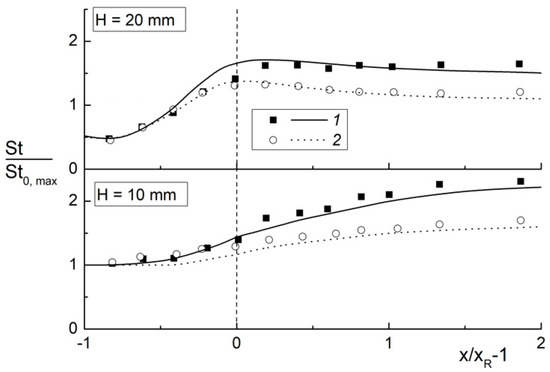 Heat transfer enhancement ratio St/St0,max in the gas-droplets flow behind the backward-facing step for H = 10 and 20 mm. Symbols are the results of experiments of [16], lines are the author’s simulations. Um1 = 10 m/s, ReH = Um1H/ν = (0.53 and 1.10) × 104, d1 = 60 μm, ML1 = 0.04. 1: TW = 308 K; 2: 338 K.