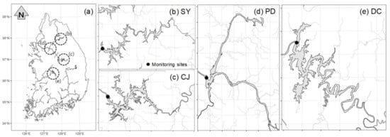 SY, PD, CJ, and DC were selected as representative artificial water-source lakes in South Korea (Table S1). SY, located in the Bukhan River upstream of PD, was created after the construction of a multipurpose dam in 1973. It is the deepest artificial lake in South Korea (118 m at the full water level) and the largest lake in South Korea, with a basin area of 2703 km2, a water storage capacity of 2900 MT, and an annual water supply of 1213 MT. PD was formed in 1973 by the construction of the downstream Paldang dam, where the Bukhan River, Namhan River, and Gyeongan Stream intersect. The Paldang dam was originally constructed for power generation, but it currently serves as a multipurpose dam for supplying water to 26 million people in South Korea. The PD has a basin area of 23,800 km2, a total water storage capacity of 244 MT, and a daily water supply plan of 880 MT. CJ was formed in 1985 by the construction of a multipurpose dam, and it exhibits the second-largest water storage capacity after SY. Located on the Namhan River upstream of PD, CJ has a basin area of 6648 km2, a water storage capacity of 2750 MT, and an annual water supply of 3380 MT. DC was created when the multipurpose Daecheong dam was constructed in 1980. Located in the central region of South Korea, it exhibits a basin area of 3204 km2, a water storage capacity of 1490 MT, and an annual water supply of 1649 MT [].