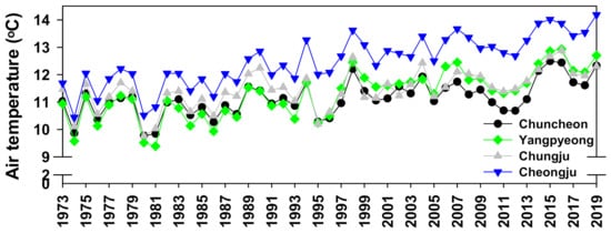 The air temperature was low in Chuncheon, which exhibited the highest latitude. The air temperature of Yangpyeong was lower than that of Chungju before 1997. However, after 1997, the air temperature of Yangpyeong increased marginally. In addition, Cheongju, with the lowest latitude, exhibited a high range of air temperatures (Figure 2).