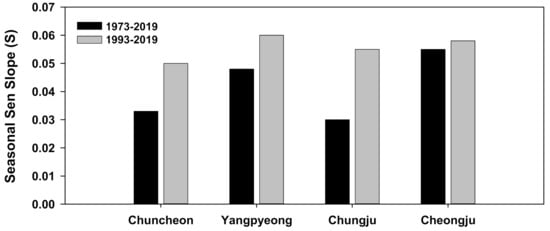 The seasonal Kendall test generates an overview figure of the whole year that does not include monthly or seasonal statistics []. Therefore, we used annual seasonal means (spring, summer, fall, and winter) to repeat the Mann-Kendall test and the Sen method by year. The Mann-Kendall test results (Table S3) displayed statistically significant increases in the air temperature by season except for some winters (p < 0.05). Excluding seasons without statistical significance, the slope of the air temperature increases for the past 27 years (0.033–0.075 °C) increased more than that for the past 47 years (0.024–0.058 °C). This increase was greater in summer (0.057–0.075 °C).