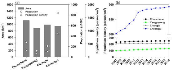(a) Population densities in 2019 and (b) population density variation in Chuncheon, Yangpyeong, Chungju, and Cheongju.