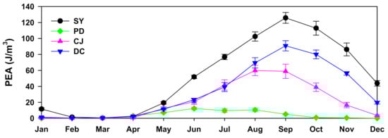 The stratification intensities of SY and DC, which are freshwater lakes, were much higher than those of the sea areas, and the monthly maximum stratification intensity was particularly high in summer. Stratification reached full scale in May. The maximum stratification observed in June for PD, with a low water depth, was faster than that in the other lakes. Stratification was observed in August for CJ and in September for SY and DC. The stratification intensity weakened at the start of September for PD and CJ, which demonstrated a mixing pattern that was initiated in December. The stratification weakened from October in DC and SY but remained until December. The monthly average PEA exceeded 30 J/m3 from June to December for SY, from July to November for DC, and from July to October for CJ. PD displayed an increasing pattern of PEA from June to August, but it was not higher than the monthly average.