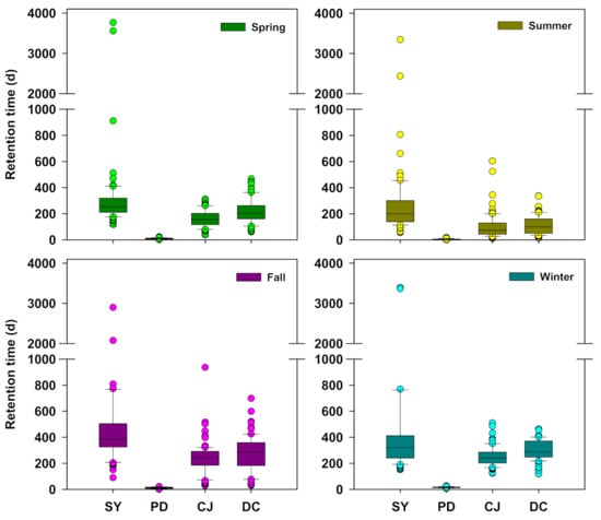 Figure 6 shows the seasonal retention time in lakes. The average retention time was the highest in SY, followed by DC, CJ, and PD. SY exhibited a retention time of over 200 d in every season. Its retention time was the shortest in summer (232.9 d) and longest in fall (451.7 d). DC exhibited the shortest retention time (128.0 d) in summer and the longest (307.8 d) in fall, whereas CJ exhibited the shortest retention time (116.5 d) in summer and the longest (247.9 d) in fall. PD displayed the shortest retention time throughout the year. Thus, the retention time was the longest in fall, followed by winter, spring, and summer. Except for PD, the retention time was the longest in fall and the shortest in summer due to the intensive rainfall during this period. PD displayed the shortest retention time (5.6 d) in summer and the longest (14.7 d) in winter (December–February of the following year).