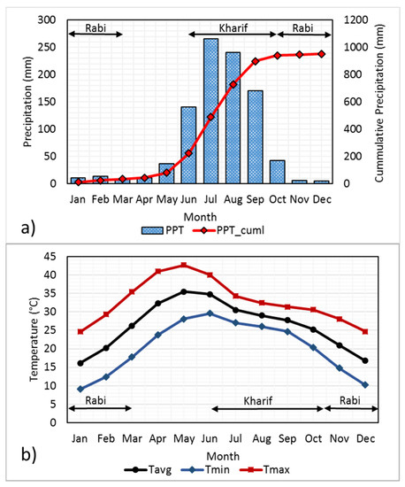 (a) Average monthly precipitation and cumulative rainfall (b) average, minimum and maximum monthly temperature highlighting the Kharif and Rabi season.