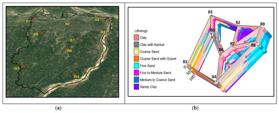 (a) Borelogs location in the study area; (b) fence diagram representing geological settings.