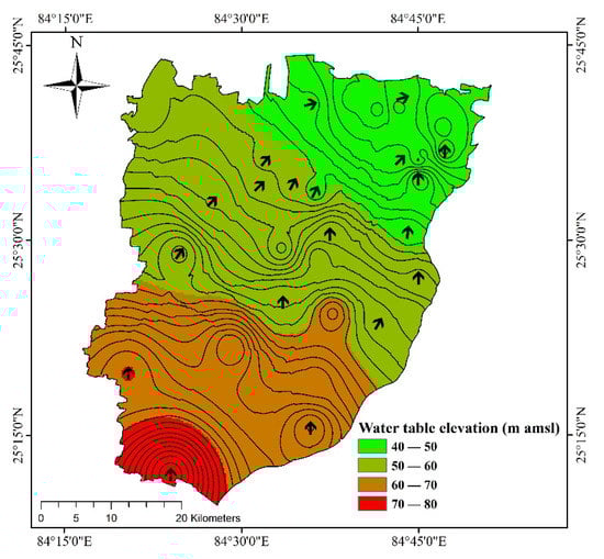 The groundwater level data analyses (data collected from Central Ground Water Board (CGWB)) shows variation of groundwater level across the study area. The deepest groundwater level was observed in the north and northeast part of the study area. The unconfined aquifer has an average groundwater level ranging from 3 m bgl to 9 m bgl (data collected in pre-monsoon season, May 2017); the hydraulic gradients is about 0.0005 and groundwater flow directions are north and northeast (Figure 4) towards the river Ganga. In the pre-monsoon season, groundwater feeds into the Ganga river.